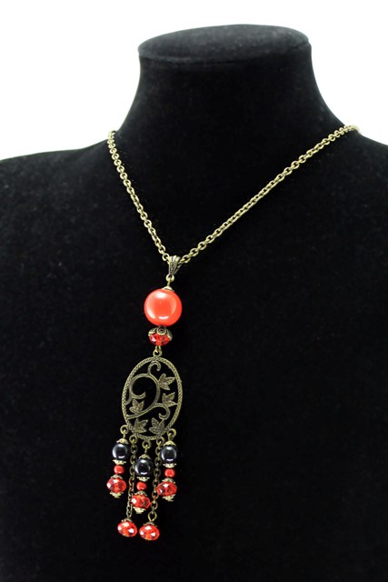 A beautiful, long, brass chain with a filigree chandelier in red and black.