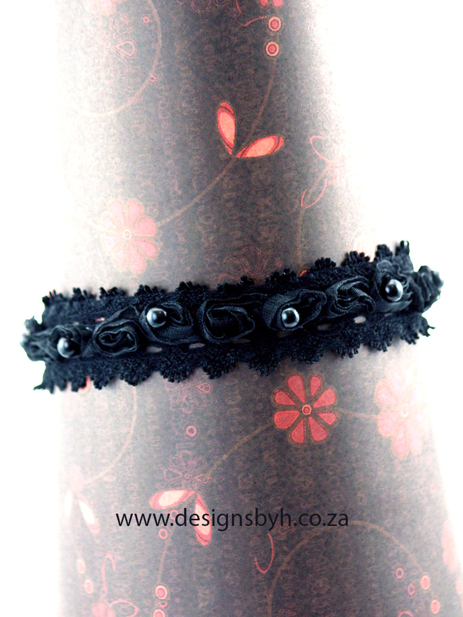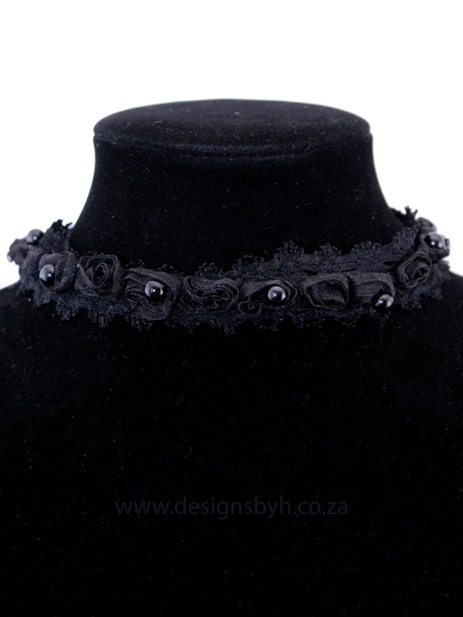 A soft, lacy choker with miniature roses and beads. Slightly elasticated for comfort.