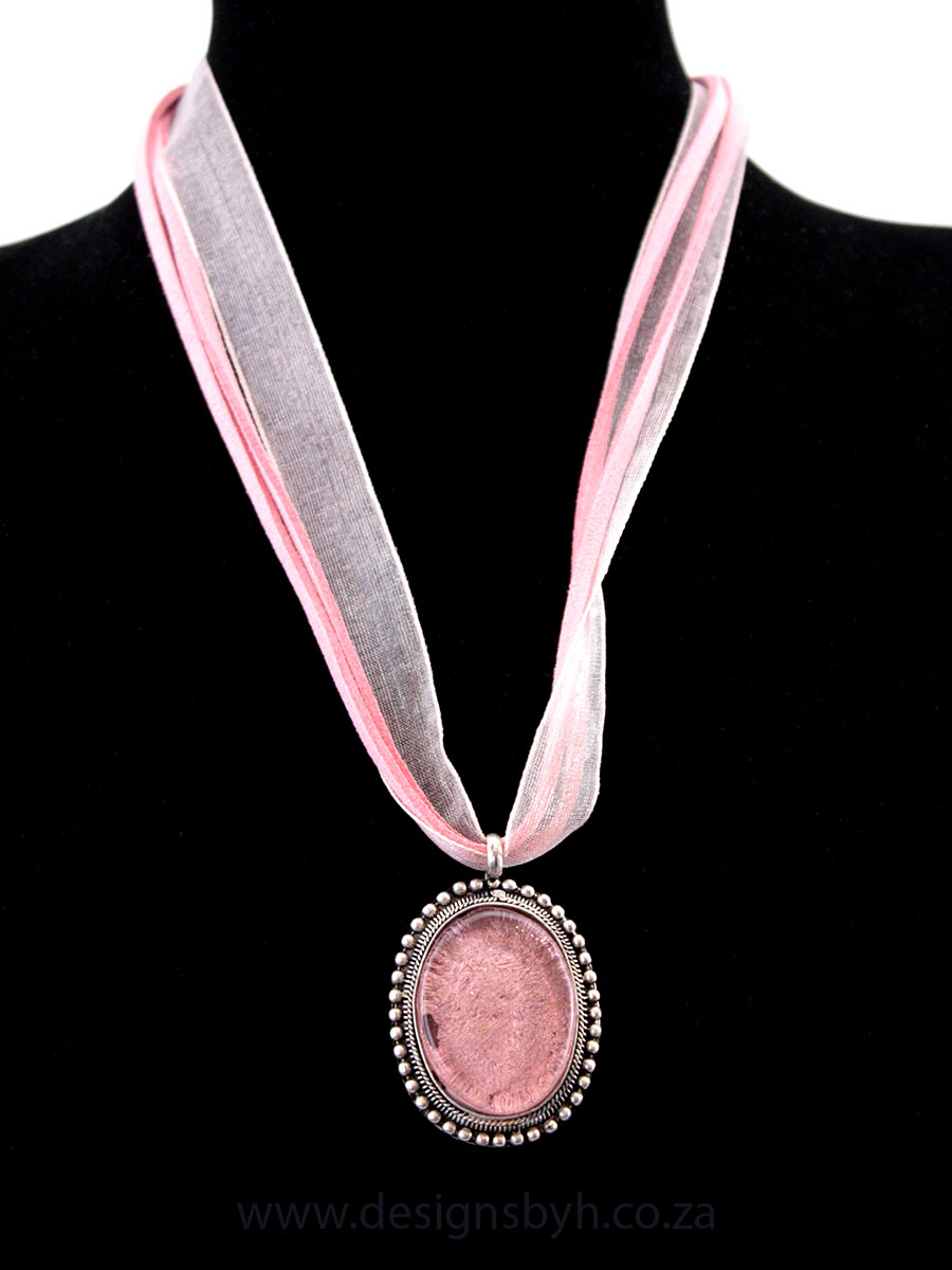 A comfortable, soft pink necklace with leather and ribbon.